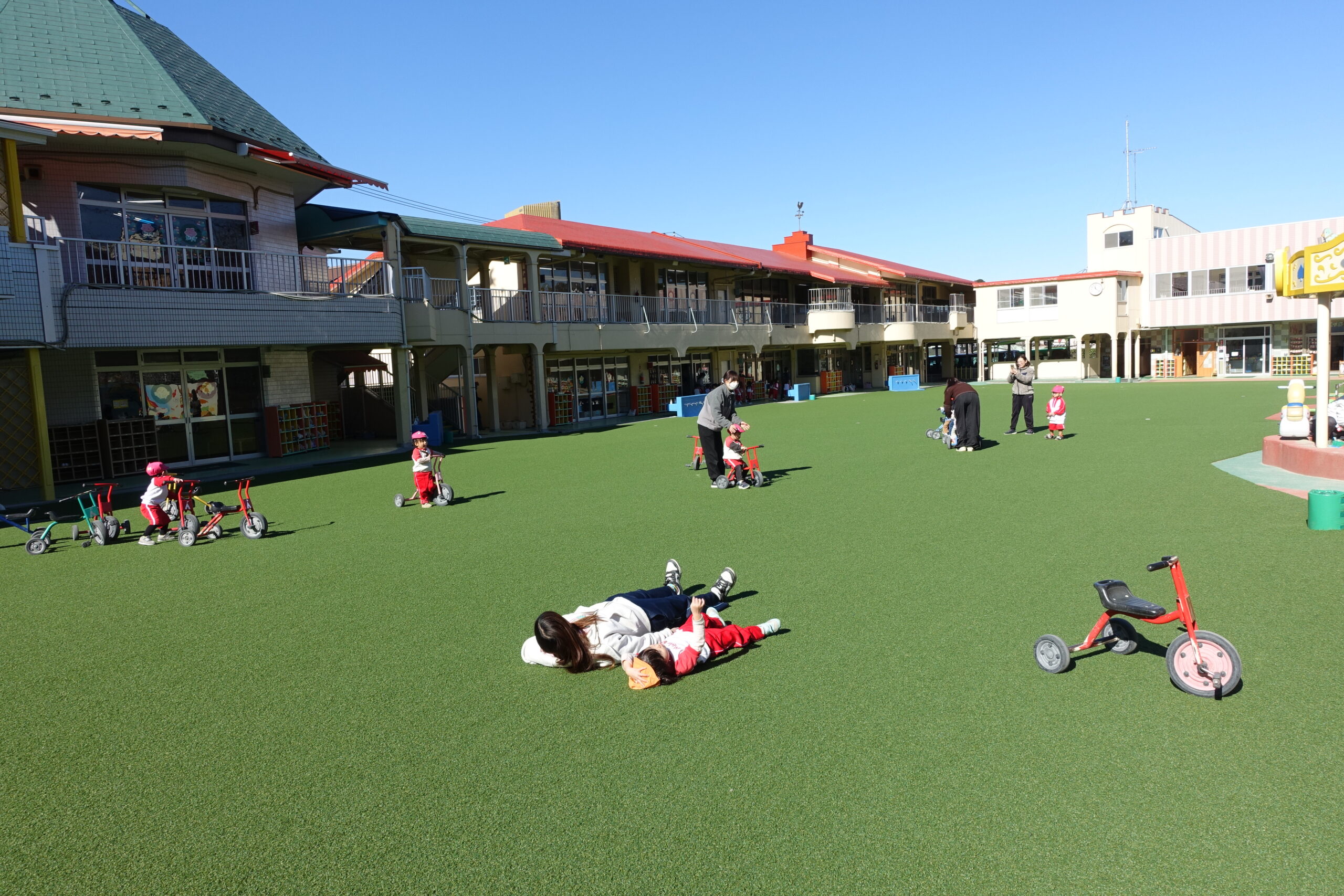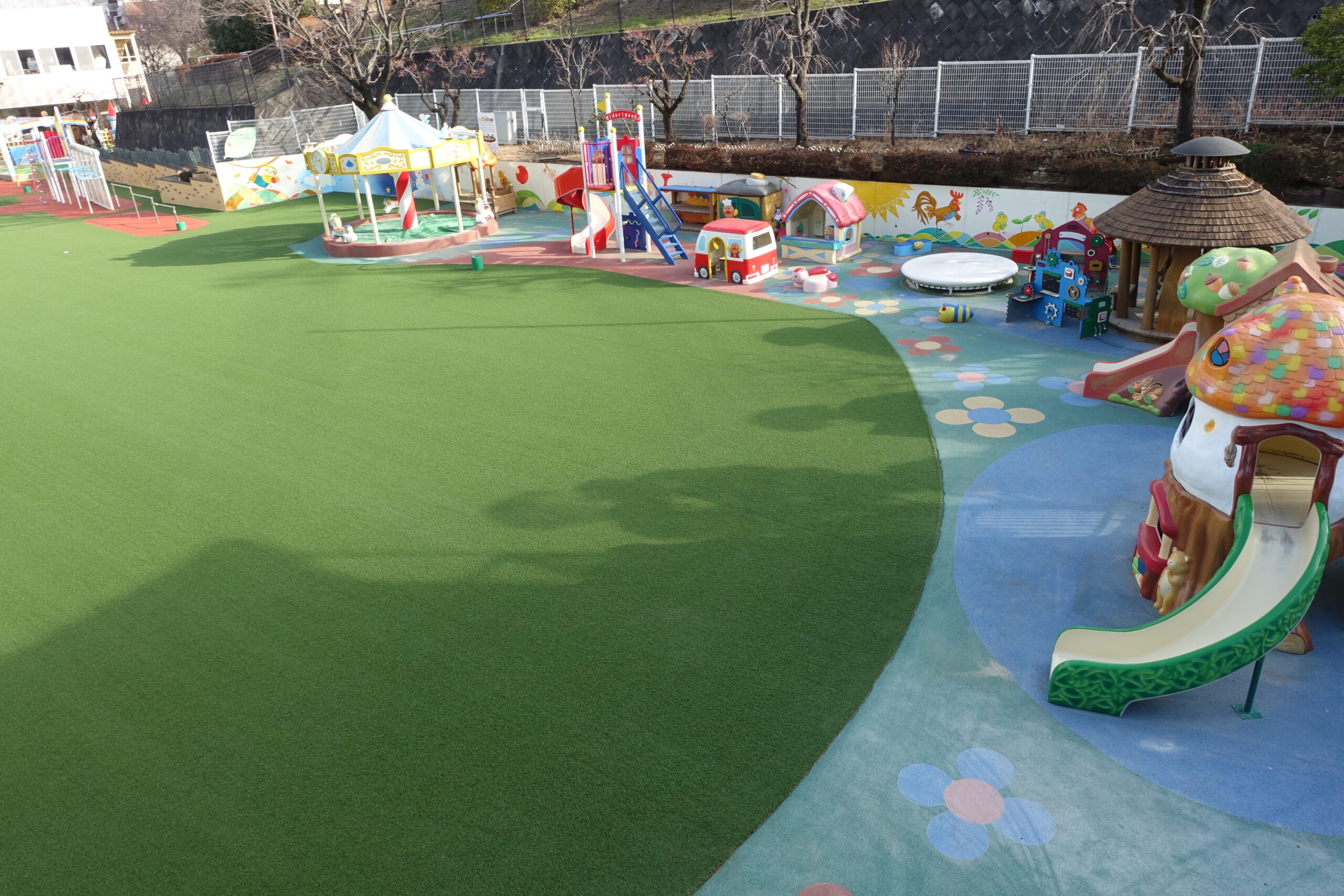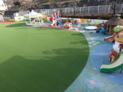 国内においては天然芝の導入の学校や園も多数存在します。天然・人工それぞれメリットが多々あると考えます。人工芝のメリットはやはり養生(子どもの立入禁止)期間がないこと、本園では子ども達がとても多数の三輪車を使っていますが、今回の新しい素材では三輪車も自由に使え、芝が剥がれるという気を遣わずに1年間伸び伸び遊べること、そして1年間常に緑であることであることが大きいと考えます。子ども達の安全面にも当然メリットがあります。