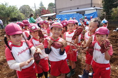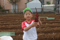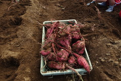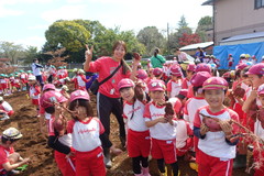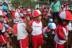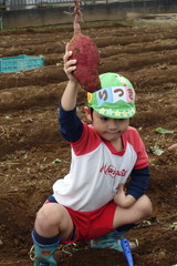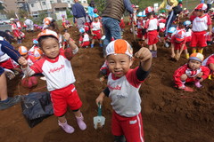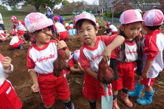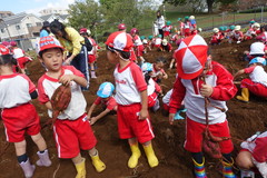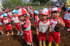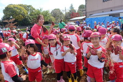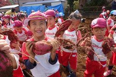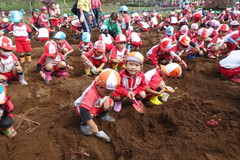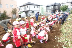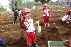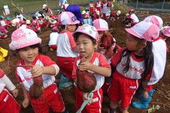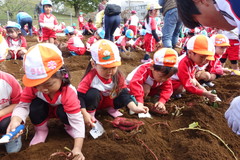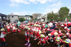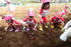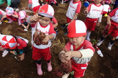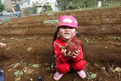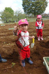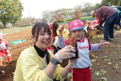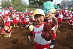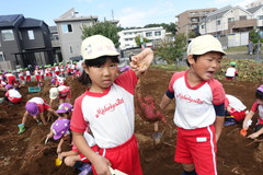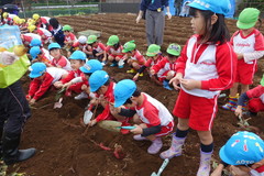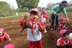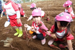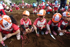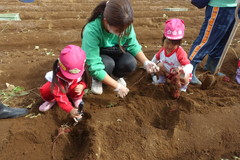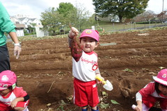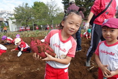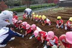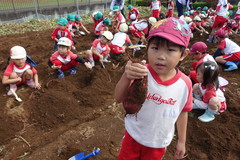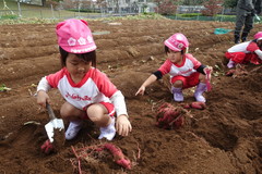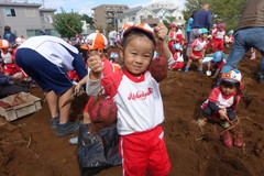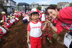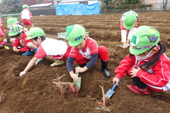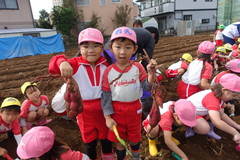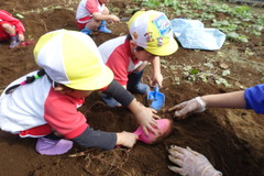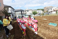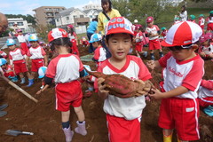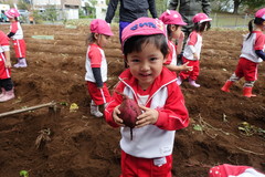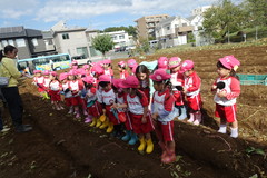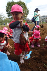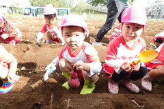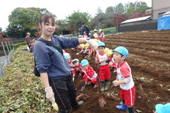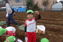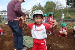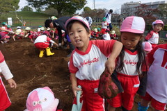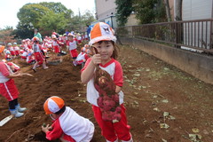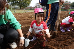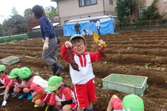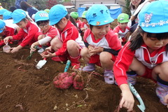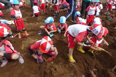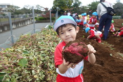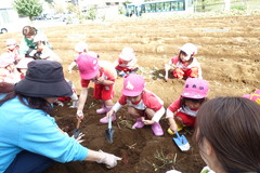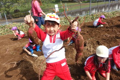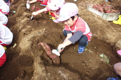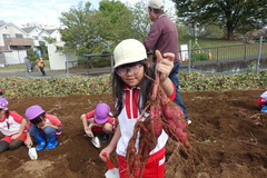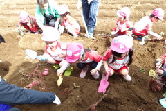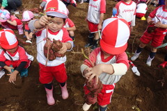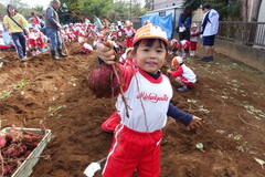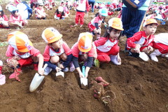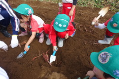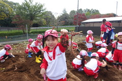 運動会や秋の遠足等を通して心身と共に大きく成長した子ども達は、以前生育状況を観察したさつまいもをみんなで掘りに行きました。幼稚園から徒歩15分程のところにあるため、年少少(満3歳児)は幼稚園バスで、年少以上はお散歩して農園へ向かいました。さつまいも観察の時ではツルがたくさんありましたが、当日はきれいに刈り取られ、ふっくらしたとても掘りやすい状態で子ども達は頑張って掘り、おいもが見つかると「あった!」と歓声が上がっていました。秋の自然や実りを体験するとても良い機会となりました。