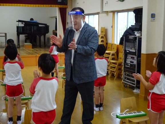 6月1日からの学年別分散登園が先週で終わり、本日から全園児通常登園に戻りました。約3か月ぶりの全学年一緒の通園バスも定刻通りの通常登園となりましたが、子ども達は分散登園で段階的に慣れてきたこともあり、きょうも普段通りの自然体でニコニコ笑顔で登園してくれ、全園児揃っての幼稚園が始まりました。お休みゼロのクラスも15クラス中、7クラスもありました。幼稚園としては一層感染予防に努め、手洗いの徹底、バスも含めた園内すべての定期的消毒、子ども達の健康管理をしっかりとしてまいります。なお、本日年中のアレックス先生の英会話指導、年長の田中先生の音楽指導がありましたが、みんな積極的に楽しく取り組んでいました。音楽指導では、広いホールにて子ども同士の間隔を開け、頑張っていました。