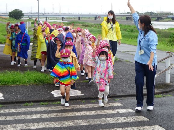 きょうは朝から雨が降ったりやんだりの一日でした。きょうと明日、年長さんはクラスに分かれて多摩市立交通公園に行き、交通安全について学んでいます。心配された天気でしたが、交通公園のご配慮により、子ども達は観光バスの中で交通安全のDVDを見たり、教室の中で密を避け、間隔を開けて座り、大切なお話をとても楽しく聞き、理解できたようでした。特に今年は春の遠足ができなかっただけに、幼稚園から大きな観光バスに乗り、一層楽しかったようです。明日のクラスも楽しみにしてください。