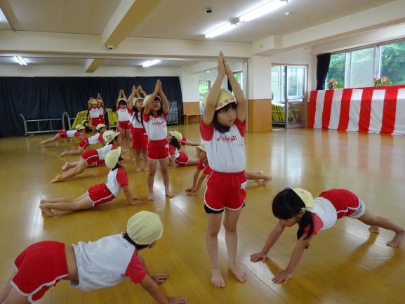 今週も梅雨空が続きますが、今日は雨も上がり涼しい陽気のなか、子ども達は元気に楽しく過ごしていました。今日の年長体育指導では、引き続き組体操の練習に取り組み、いくつものワザをひと通り行い、とても前向きに少しずつ出来上がっていくことを喜びと感じながら、頑張っています。