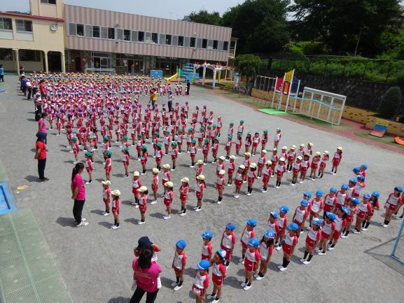 6月1日から始まった1学期では、短い期間にもかかわらず、限られたなかで様々な指導や七夕まつり、じゃがいも掘り、盆踊り会等について子ども達はとても楽しみ、そして心身共に大きく成長し、本日の終業式を迎えることができました。今年度初めて年少さんも含め、全園児が園庭に並び、お話を聞くことができました。園庭が広いため、15クラス間を開けて並び、真剣に集中して参加する姿が見られました。来週1週間の夏季保育を経て、8月1日より全園児夏休みとなります。なお、明日年長さんは、日帰り旅行の「わくわくデイキャンプ」に出かけます。コロナウイルス感染拡大防止のため、日帰りとなってしまいましたが、内容は例年と同じものとなっています。幼稚園生活の良い思い出にしてほしいと願っています。