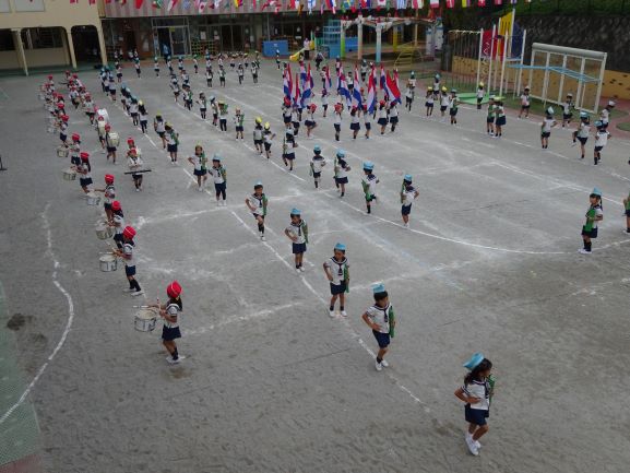 週明けの月曜日、広い園庭にはキンモクセイの香りが漂うなか、子ども達は元気に過ごしていました。運動会を控え、子ども達はとても充実した日を送っています。年少さんはアレックス先生の英会話をクラスごとに受け、ゲラゲラ笑いながらとても楽しく参加していました。また年長さんはマーチングバンドのリハーサルを行い、自信をもって堂々取り組み、3年間のしっかりとした心身の成長を感じさせられています。今年は子ども達もよく知っている「日本のアニメメドレー」を150人の子ども達だけで、壮大なオーケストラとして奏でます。また新型コロナウイルス感染拡大防止のため、うたは初めて「ハミング」をご披露いたします。ぜひ緑ケ丘ならではの感動的な運動会をお楽しみに。