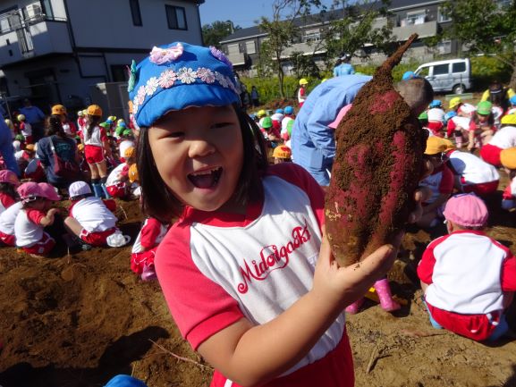 きょうは全園児でさつまいも掘りを行いました。先日生育状況を幼稚園からお散歩しながら、観察した「さつまいも」をみんなで掘りました。お天気も秋晴れの絶好の陽気のなか、子ども達はとても意欲的で一生懸命シャベルを使って掘ることができました。今年はここ数年のなかで、一番の豊作で、大きなおいもがたくさん出てきました。とても数多くの収穫ができましたので、園児全員お持ち帰りができました。ぜひご家庭でご賞味いただければ幸いです。緑ケ丘幼稚園の子ども達は夏はじゃがいも、冬はさつまいもと自然に触れ、収穫体験を通して、食育や生きる大切さを実感できています。