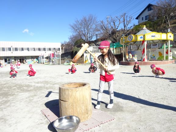 ここ数日真冬並みの寒さが続いていますが、子ども達は朝から元気いっぱいに楽しく過ごしていました。今の各クラスや子ども達の話題は、2月のおゆうぎ会に向けて、役決め等で盛り上がっているようです。毎年ひとり一人が役になりきって、とても楽しく演じる姿が見られます。本日はおもちつきが行われました。今年は新型コロナウイルス感染拡大防止のため、食べ用はつかず、子ども達がつくのみで行いましたが、全員ヨイショヨイショと掛け声をかけ、ウスとキネを使って元気にもちをつき、日本古来の行事に親しむことができました。