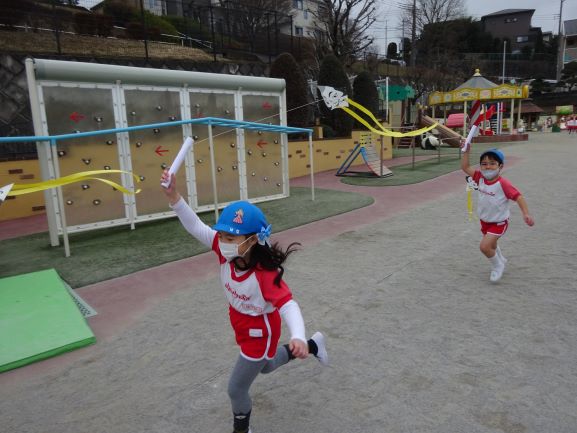 きょうは朝のうちまで小雨が降る肌寒い一日でしたが、子ども達はそれぞれの活動に楽しく頑張っていました。年長さんはかがくタイムが行われ、きょうのテーマは「紙だけで作った凧をあげよう」で、紙の性質を意見を出し合いながら考察し、その紙の特性を生かした凧づくりに挑戦していました。子ども達が凧を作り上げる頃には、お天気も良くなり、広い園庭で凧あげも楽しく行っていました。紙と風を利用した遊びに子ども達はとても興味津々で取り組んでいました。