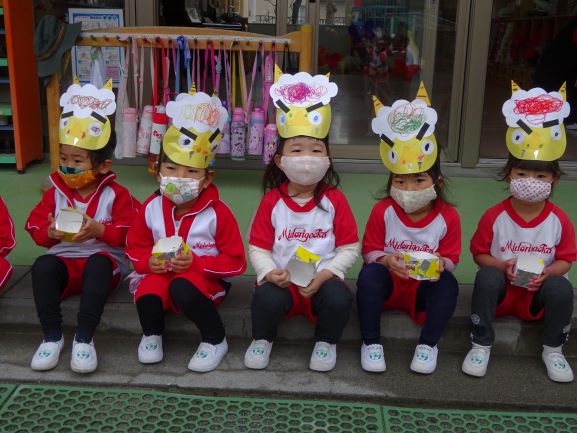 朝方まで降っていた雨があがり、子ども達は全員園庭に出て、本日の節分にちなみ、みんなでまめまきを行いました。保育のなかで作った鬼のお面をかぶり、大きな声で「おにはーそと、ふくはーうち」とまめをまき、心のなかの悪い鬼がみんな出て行き、幸せがいっばいやってきました。明日は立春、みんな1年間健やかに大きく成長することでしょう。
