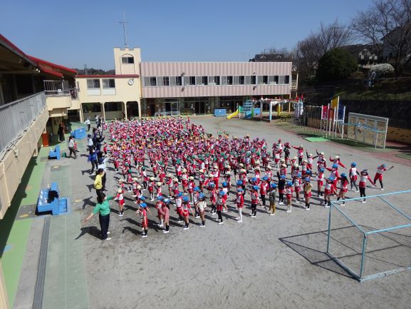 幼稚園の花壇にあるしだれ桜が開花し、春本番の陽気のなか、本日令和2年度の通常保育が終了し、明日卒園式、明後日終了式を迎えることとなりました。子ども達は心身ともに大きく成長し、人生における生き抜く力がしっかり培われました。ぜひ卒園式や終了式では、お子様の凛々しい姿をご覧ください。保護者の皆様方のご理解・ご協力に御礼申し上げます。写真は昨日最後の一日保育での広い園庭にて、全園児で体操している様子です。