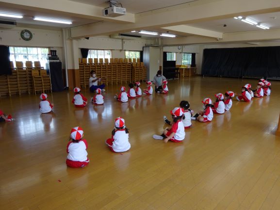 幼稚園にある木々も新緑に覆われ、何をするにも心地よい陽気のなか、子ども達は新年度園生活に大分慣れ、元気に楽しく過ごしています。年少さんは、幼稚園のホールにて間隔を開けて初めての体育指導に取り組みました。新しい体験に目をキラキラ輝かして、とてもよく頑張っていました。からだを動かす楽しさを知り、長い人生をたくましく生き抜く基礎が培われると思います。