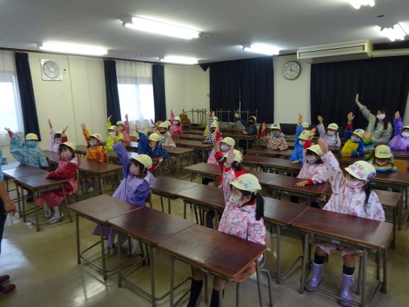 今日は朝から一日雨模様で、子ども達はお部屋で楽しく過ごしていました。昨日に続き、年長うめ・きく組のお友達は幼稚園から大型バスに乗って、交通公園にて交通安全指導を受けました。雨天のため室内中心でしたが、お話をとてもよく聞け、来年の小学校入学へ向け安全に関する意識を高める良い機会となったと思います。