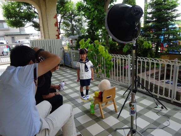 年長さんはピロティにてひとり一人の卒園アルバム用の個人写真撮影が行われました。可愛いセーラー服を着て、いつもよりおしゃれに登園してきた子ども達、トミタスタジオさんから様々な声を掛けられて、とても素敵な表情を見せてくれました。