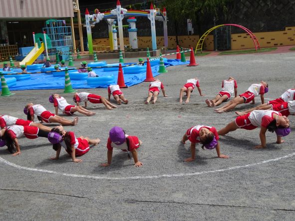 きょうまでの4日間の夏季保育は自由登園にて、ひとり一人の水遊びや8月お誕生会等楽しく行われました。明日からはいよいよ2学期が始まります。感染予防を徹底しながら、子ども達の大切で安心できる居場所である幼稚園で、様々な楽しい体験ができることと思います。写真は本日夏季保育で行われた年長組体操のひとこまです。