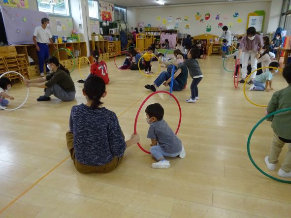 幼稚園と共にひよこ教室も2学期がスタートいたしました。検温・消毒・換気を徹底して、子ども達にとって安全で楽しい居場所としてひよこ教室が行われています。今日のたいそうコースでは、フープ遊びをとても楽しく行いました。フープをくぐったり、電車になったり、お池になったり、広い保育室で間隔を開けて元気にからだを動かす体験ができました。