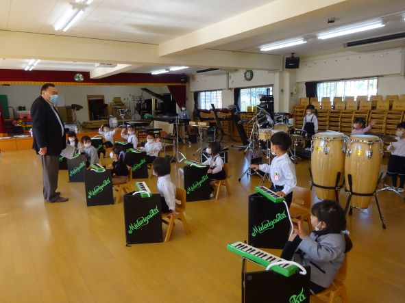 きょうは朝から良い天気となり、子ども達は広い園庭で元気に遊んでいました。きょうは年少の音楽指導が行われ、12月の府中どりーむホールで行われる音楽発表会に向けての練習も始まりました。楽しみながら少しずつ練習し、みんなで音を出し合わせる感動体験や自分が頑張って出来上がっていく喜びを感じながらのとても楽しく充実した取り組みとなっています。緑ケ丘幼稚園での様々な特色ある体験が、今後の生き抜く力につながっています。