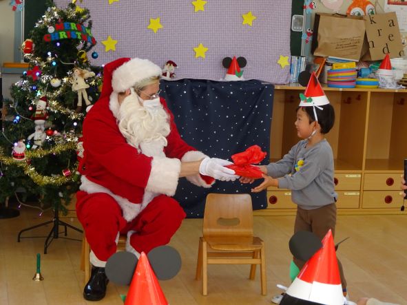 昨晩から早朝までの風雨が子ども達が登園する頃には止み、広い園庭の水もすぐにはけ、子ども達は朝から元気に遊ぶことができました。本日からひよこ教室ではクリスマス会が行われ、緑ケ丘幼稚園本物主義の一つとして、毎日外国からのサンタクロースさんが登場しています。子ども達は最初びっくりしていましたが、プレゼントをもらう頃にはにこにこしていました。