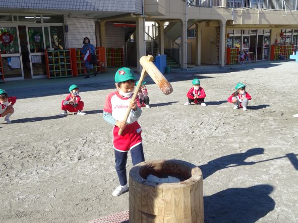 きょうは朝から良い天気で風もなく、絶好のおもちつき日和となりました。子ども達全員ひとり一人、つき用のおもちをうすときねを使ってつきました。また2年ぶりに持ち帰り用のおもちも体操の先生やバス運転手さんがつき、子ども達は興味津々に観察していました。日本古来の文化を知る良い機会となりました。お手伝いをしていただいた本部役員さん、年長役員さんありがとうございました。