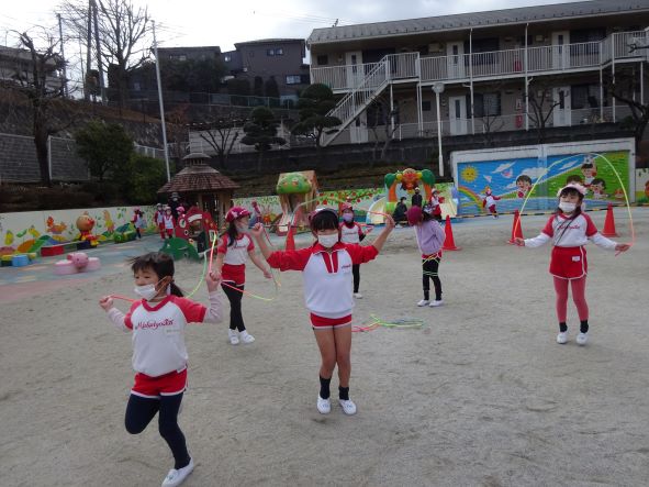 寒中の寒さが続きますが、子ども達は元気いっぱいで朝から元気に遊んでいました。半袖体操服で過ごす子ども達も数多くいます。昨日までの各クラスや体育指導で、なわの安全な使い方の指導が終わり、今日の外遊びから年中・年長は「なわとび」が始まりました。朝から広い園庭で元気に跳ぶ子ども達が多く、心身の成長につながっています。コロナ禍のなか、広い園庭で様々な運動を伸び伸びと行い、丈夫なからだが作られることを願っています。