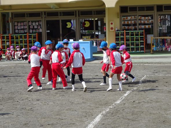 おゆうぎ会を終え、心身共にたくましくなった年長さんは、今年度最後のイベント「クラス対抗サッカー・ドッジボール大会」に元気に参加しました。今年度はコロナ禍のため、例年のような練習が思うようにできませんでしたが、子ども達はみんな集中して取り組み、園生活での多様な体験による生き抜く力がしっかり培われているようでした。年長さんにとって園生活も残りわずかとなってきました。いっぱい楽しんで、素晴らしい思い出を作ってほしいと願っています。