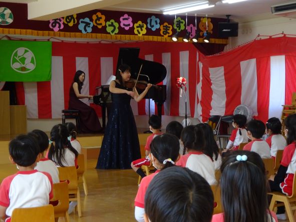 緑ケ丘幼稚園における多様な体験教育、特に本物に出会う大切さを教育に掲げ、その一環として毎年バイオリン・ピアノコンサートを行っています。今年もコロナ禍でしたが、学年のなかでも何回にも分散して密のないように実施いたしました。昨年12月府中どりーむホールで演奏した全曲やディズニーメドレー等子ども達にとって馴染みのある曲ばかりで、とても楽しい体験となりました。