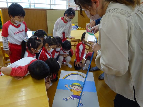 年長さんは本日初めての「かがくタイム」を行いました。本日のテーマは「鏡の不思議ワールドへようこそ!」で、大きな鏡を使って様々なものを映し出したり、お持ち帰り用の小さな鏡で不思議シートを映して楽しく遊びました。ひとつひとつをみんなで考え、意見を出し合い、目をキラキラ輝かして取り組んでいました。かがくタイムでは、かがくの発見・驚き、感動を体験しながら、考える力、好奇心を育つよう工夫されたワクワクドキドキタイムとなります。お楽しみに。