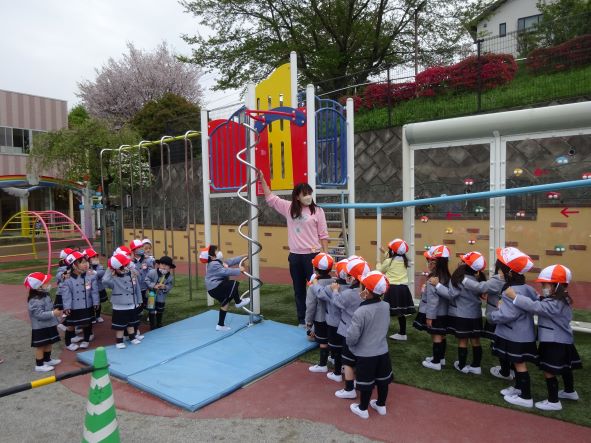 今日の朝は久しぶりに良い天気となり、昨日担任より固定遊具の安全な使い方の指導を受けた年少のお友達も広い園庭で元気に遊ぶことができていました。緑ケ丘幼稚園では毎年大型遊具を新しくし、2か所あるお砂場の砂も定期的に入れ替え、増量し、清潔で安全な環境で子ども達は伸び伸びと過ごしています。