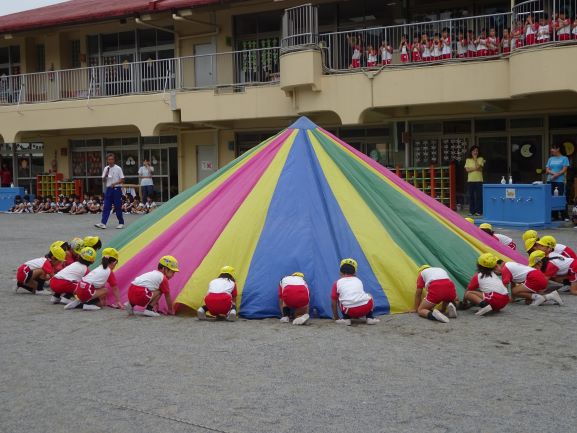 本日の年中体育指導では、運動会でご披露する「バルーン」に取り組みました。7月の体育指導はプールが多かったため、久しぶりでしたが子ども達はよく覚えていて、音楽に合わせて楽しみながら、集中して頑張っていました。朝から広い園庭で元気いっぱいに遊ぶ子ども達は、みんなで力を合わせて取り組む時は、本当に一生懸命取り組むことができています。遊びと学びのバランスのとれた、幼稚園生活となっています。