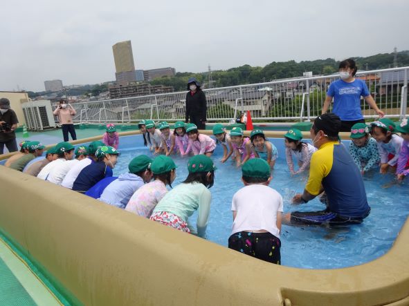 今週になってから蒸し暑さが続き、広い園庭には朝からスプリンクラーやミストシャワーが大活躍で、子ども達は冷たい水に涼んで楽しく遊んでいます。また年長さんも本日今季初プールとなり、クラスごとにプールを楽しんでいました。3年ぶりにクラスみんな一緒にプールに入り、元気な笑顔が数多く見られました。