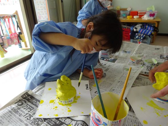 今日も暑さが厳しくなり、午後の自由遊びは冷房の効いた室内で過ごしました。保育の中では絵画造形活動が行われ、年少さんも紙粘土の色塗りに真剣に集中して取り組み、成長が感じられています。緑ケ丘幼稚園では、伸び伸びと元気に遊び、また真剣に頑張る時は頑張るというメリハリのついたバランスのある活動が子ども達の生き抜く力を培っています。