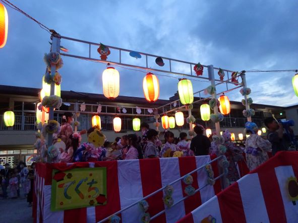 先週の土曜日には3年ぶりに保護者の方もご一緒にお楽しみいただく「盆踊り会」が行われました。子ども達は浴衣等を着て、保育の中で練習した踊りを頑張って取り組んでいました。緑ケ丘幼稚園の広い園庭には、本格的なやぐらが設置され、夏の夕暮れのひと時を楽しく過ごしていただけました。