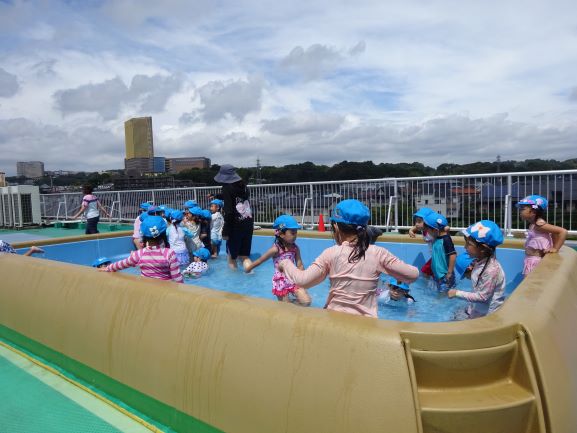 本日は朝のうちは涼しさを感じられましたが、日中は予報通り暑くなり、年中さんは最後のプールを満喫していました。夏休みを終えた子ども達は生活リズムもすっかり戻り、園生活を楽しんでいます。明日からはいよいよ2学期でお弁当・給食のある一日保育となります。緑ケ丘幼稚園ならではの広い園庭で伸び伸びと遊び、様々な体験を通していっぱい楽しみ、大きく成長しましょう。