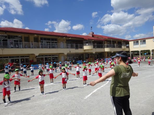 9月も半ばを過ぎ、保育のなかでも運動会の練習が本格的に始まりました。まだ暑さが残るため、広い園庭では少しずつ無理ないように配慮していますが、子ども達はみんなで力を合わせて目標に向けて取り組む楽しさを実感しながら、頑張っています。写真は年中「鳴子ダンス」の練習模様です。なお、今年度の運動会も幼稚園園庭にて、学年ごとの3部制の分散形式で行う予定です。