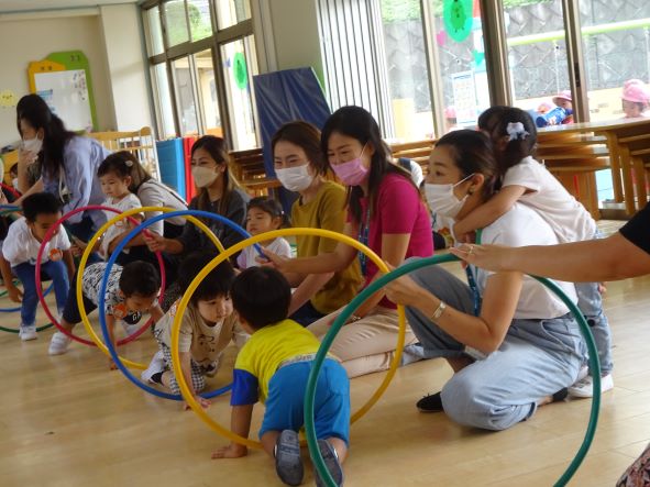幼稚園の花壇や周囲にあるキンモクセイが甘い香りを漂わせ、秋本番の陽気となってきました。子ども達は朝から元気いっぱいに過ごし、様々な活動に意欲的に取り組んでいます。子ども達は最適な環境により素晴らしい可能性を伸ばしていきます。運動会の練習にもキラキラかがやきながら、楽しく取り組んでいます。またひよこ教室のお友達も2学期に入り、遊びの楽しさも実感し、毎週元気に通っています。本日のひよこたいそうコースでは、フープを使った様々な運動遊びをしていました。親子一緒に遊ぶことのメリットを生かし、とても楽しい時間となっています。
