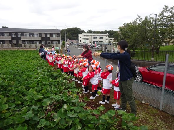 運動会を終え、心身共に大きく成長した子ども達は秋の爽やかな陽気のなか、園生活を元気に楽しく過ごしています。本日年少のお友達は、幼稚園からお散歩して、幼稚園のさつまいも畑農園に行き、さつまいもの生育状況を観察しました。大きな葉や長いツルに興味津々でした。みんなで大きくなーれとおまじないをしました。その後隣のお山がある中和田橋公園で、ゴロゴロ遊んだり、大きなどんぐりをいっぱい拾うことができました。
