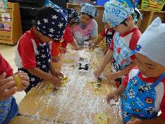 日に日に初夏の陽気となり、子ども達は広い園庭ではスプリンクラーで涼んだり、お砂場で泥んこ遊び等にも楽しんでいます。昨日フィンガーペインティングで絵の具を好きなだけ遊んだ年少さんは、今日はかわいいエプロンや三角巾をつけて、コックさんに変身。型抜きやトッピングをして美味しいクッキーを作りました。今後の食への関心にもつながるとても楽しい良い体験となりました。