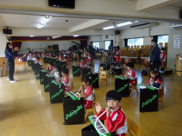 週明けの月曜日、やや雲の多い一日でしたが紅葉の木々に囲まれた園庭で、子ども達は元気に過ごしていました。音楽指導においても音楽発表会の練習が始まり、うたや合奏について、田中先生から音程や強弱についてアドバイスを受け、音がきれいに一つになることを楽しみにしているようです。緑ケ丘幼稚園では、人生における学びに向かう力や集中力、コミュニケーション能力等生きる力を体験教育という独自のカリキュラムで培っています。音楽や体操等で「できた!」体験の積重ねが人間力を高めています。12月17日(土)パルテノン多摩大ホールでのクリスマス音楽発表会では感動的なイベントになることと思います。