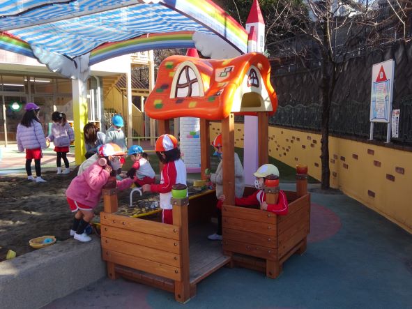 きょう日中は昨日のような冷たい風は吹かず、園庭が日だまりとなって子ども達はとても元気に遊んでいました。昨日手前のお城仕様のお砂場に「ハッピーキッチン」という新遊具が設置され、子ども達には大好評のようで泥んこの遊びが一層盛んに行われています。幼児期に好きなように手指を使っての遊びは、成長には欠かせないものといえます。緑ケ丘幼稚園では毎年遊具を設置しており、更に春までにはとても面白い遊具が奥のゴムチップに設置予定です。