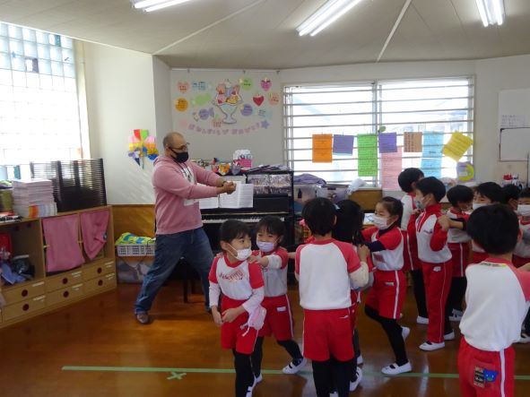 本日年長さんは園生活においての最後の英会話指導となりました。英語で遊び、様々なことを学び、外国という異文化を知る良い体験となりました。幼児期における英会話は、遊びのなかで聞き、見て、まねてからだを動かし、自然と慣れ覚え、今後の学習にとても良い影響を与えると思います。今日はじゃんけん列車を英語で楽しんでいました。