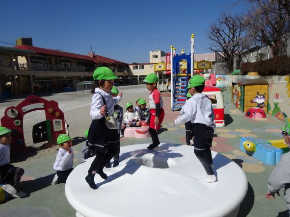 先日の新遊具ハッピーキッチンに続き、本日広い園庭の南側ゴムチップの場所にふわふわの白いトランポリンが設置されました。幼児期に必要な多様な運動の一つとして、子ども達は楽しみながらからだの様々な力を培うことができると思います。