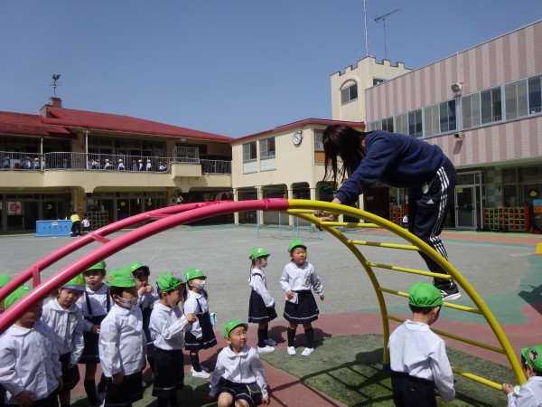 新年度保育2日目となり、子ども達も少しずつ新しくクラスに慣れ、元気に過ごしています。昨日の年長さんに続き、本日年中さんも保育のなかで各担任より固定遊具指導を受け、帰りから外遊びも始まりました。緑ケ丘幼稚園では、広い園庭で様々な遊具が設置されておりますが、必ず年度最初に全学年安全教育をした後に遊具での外遊びを行うようにしております。これから四季折々の自然に触れ、伸び伸びと遊び、心身共に大きく成長すると思います。