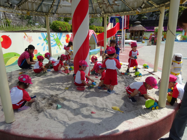今年4月より新たに始まった2歳児保育いちご組(4年保育)のお友達も毎日幼稚園に登園し、一日元気に過ごしています。きょうもメリーゴーランドのある白いサラサラ砂で楽しくお砂場遊びをしていました。