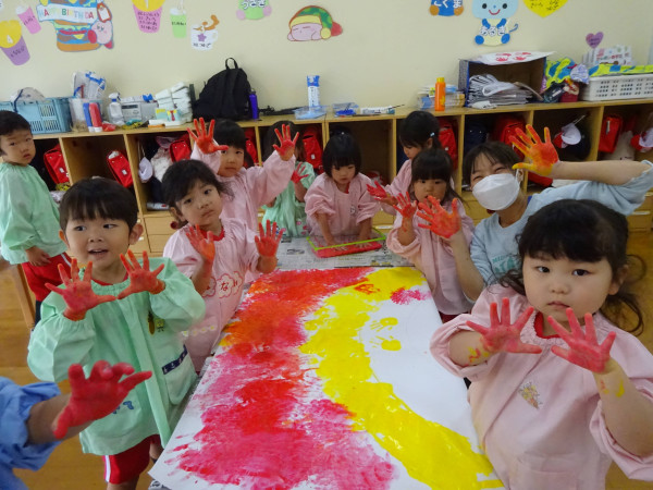 5月最後の1週間となりましたが、週明けの月曜日から子ども達は元気いっぱい。広い園庭で伸び伸びと遊び、様々な活動にも意欲的に取り組んでいます。年少さんはこれからの絵画活動の導入として「フィンガーペインティング」をとても楽しく行いました。好きなだけ手に絵の具を塗って、ペッタンペッタン、色を塗る楽しさを興味関心のもとたくさん体験できました。
