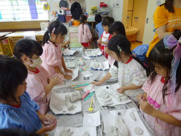 今日の午前中は雨が降り続き、幼稚園周囲のあじさいも一層色鮮やかに見える時期となってきました。幼稚園では絵画造形指導が行われ、子ども達は紙粘土を使った彫塑活動に一生懸命取り組んでいました。いちご組のお友達も楽しんでいました。緑ケ丘幼稚園では、子ども達の感性や創造性を豊かにするために、講師の先生にも来ていただき、様々な素材を使った絵画や造形活動を楽しんでいます。