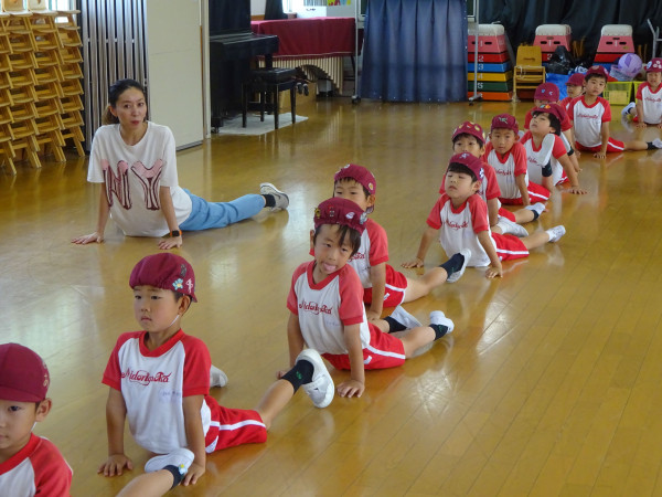 毎週金曜日にはエイベックスのリーコ先生によるダンス指導が行われています。今日は年長ふじ、ばら組のお友達が参加しましたが、様々なからだの動きを基礎からしっかり行われ、振付もだいぶ覚え軽快なテンポな音楽に合わせて楽しくダンスをすることができています。
