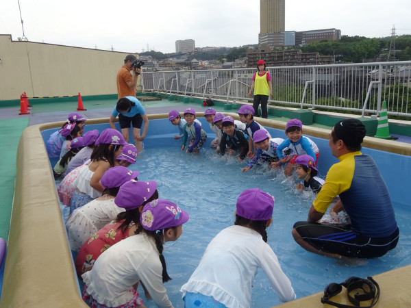 梅雨の晴れ間の一日、子ども達は水分をまめにとりながら元気に楽しく過ごしていました。年長の体育指導では、今シーズン初めて「プール指導」をクラスごとに行いました。時間を短めにして、水に楽しく親しむ機会といたしました。専属の監視員を常駐させ、AEDや緊急電話を常に近くに置き、徹底した安全体制のもと、楽しいプールシーズンといたします。