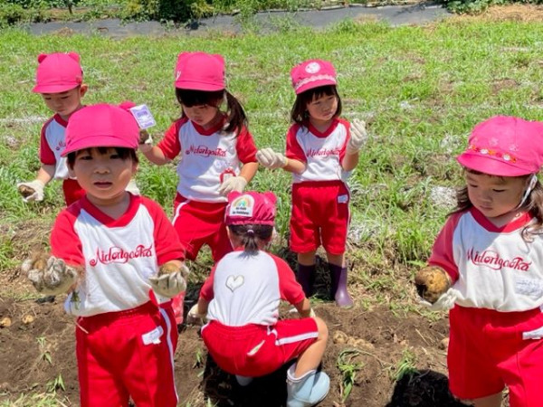 週明けの月曜日、真夏のような陽気となり、広い園庭には朝から何か所もあるスプリンクラーが大活躍で、子ども達は水遊びをしながら涼んでいました。今日はいちご組さんが幼稚園の農園にてじゃがいも掘りを行いました。いちご組さんは幼稚園から農園まで園バスで行き、到着後じゃがいもをたくさん掘ることができました。豊作のため、持ち帰りもできそうです。夏の自然に触れる良い体験となりました。