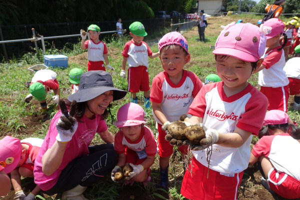 きょうも昨日に続き、猛暑となりましたが、子ども達はとても元気で楽しく遊んでいました。昨日はいちご組のお友達が全員じゃがいも掘りを楽しみましたが、本日は年少から年長さんのお友達が幼稚園農園へ行き、水分補給や休憩をこまめにとりながら、とても楽しくおいもほりを行いました。少し土のなかを掘るとたくさんのおいもが見つかり、「あったー」と歓声があがっていました。土に触れる機会の少ない子ども達にとって、夏の自然に触れ、持続可能な環境について関心を持つ良い機会となりました。