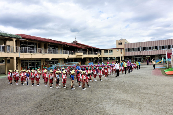 今日は昨日より雲が多く蒸し暑いなかでも、やや落ち着いた一日でした。保育も本日1学期終業式を迎え、いちご組さんも含めて園児全員380名が園庭に並び、1学期の振り返りや夏休みの過ごし方等についてお話を聞きました。みんなこの4か月心身共に大きく成長いたしました。2学期からもいっぱい元気に幼稚園生活を楽しみましょう。なお年長さんは明日お泊り保育を予定しています。
