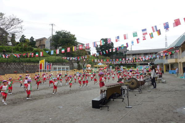 運動会前最後の一日保育となった10月5日、爽やかな秋の陽気のなか、子ども達は運動会の練習にも楽しく取り組んでいました。音楽指導では年長さんがマーチングバンドを行い、子ども達だけの演奏には感動させられました。どの子ども達も真剣に集中して演奏に取組み、終えた後の充実感や達成感が心のなかに培われ、人生における生きる力につながっています。