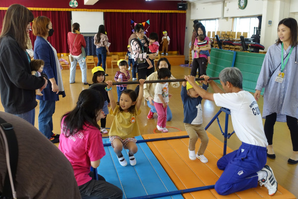 緑ケ丘幼稚園では2歳児保育も充実し、毎日通う「いちご組」と親子で週数回楽しむ「ひよこ教室」が行われ、様々なご家庭のニーズに合った多様な保育形態となっています。本日はひよこ教室体操コースが行われ、広い幼稚園ホールにおいて鉄棒にも挑戦していました。体操の先生と親子で体操を楽しむ良い機会となっています。体操コースも徐々に子ども達だけの保育に移行してまいります。