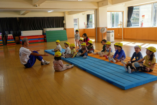 運動会を終えたひよこ教室のお友達は、今週から少しずつ母子分離が始まっています。たいそうコースでも幼稚園ホールにて、ママから離れて先生と自分達だけで楽しく体操を行っていました。マットの上できちんと成田先生のお話も聞けています。